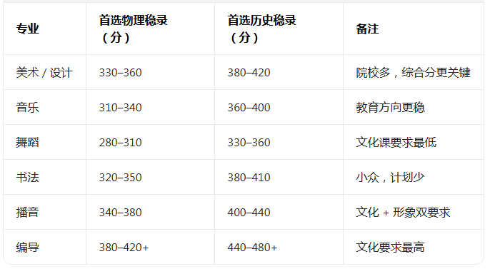 过线≠稳录:过线是基础,实际录取看综合分(如美术 = 文化 50%+ 专业 2.5×50%),专业分越高,文化压力越小。